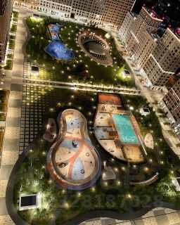 Во дворе также есть баскетбольная и футбольная площадки, каток. В вечернее время комплекс освещается подсветкой с домов и фонарями по территории двора.