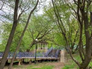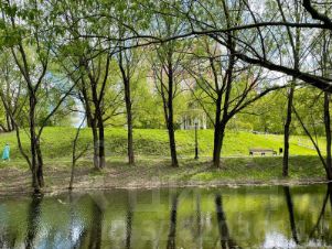 Напротив дома большой парк с прудом, зонами отдыха и барбекю