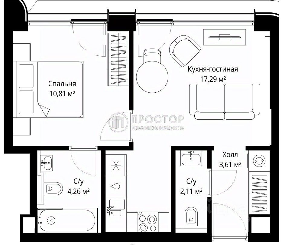 Два совмещённых санузла обеспечивают удобство для жильцов.
