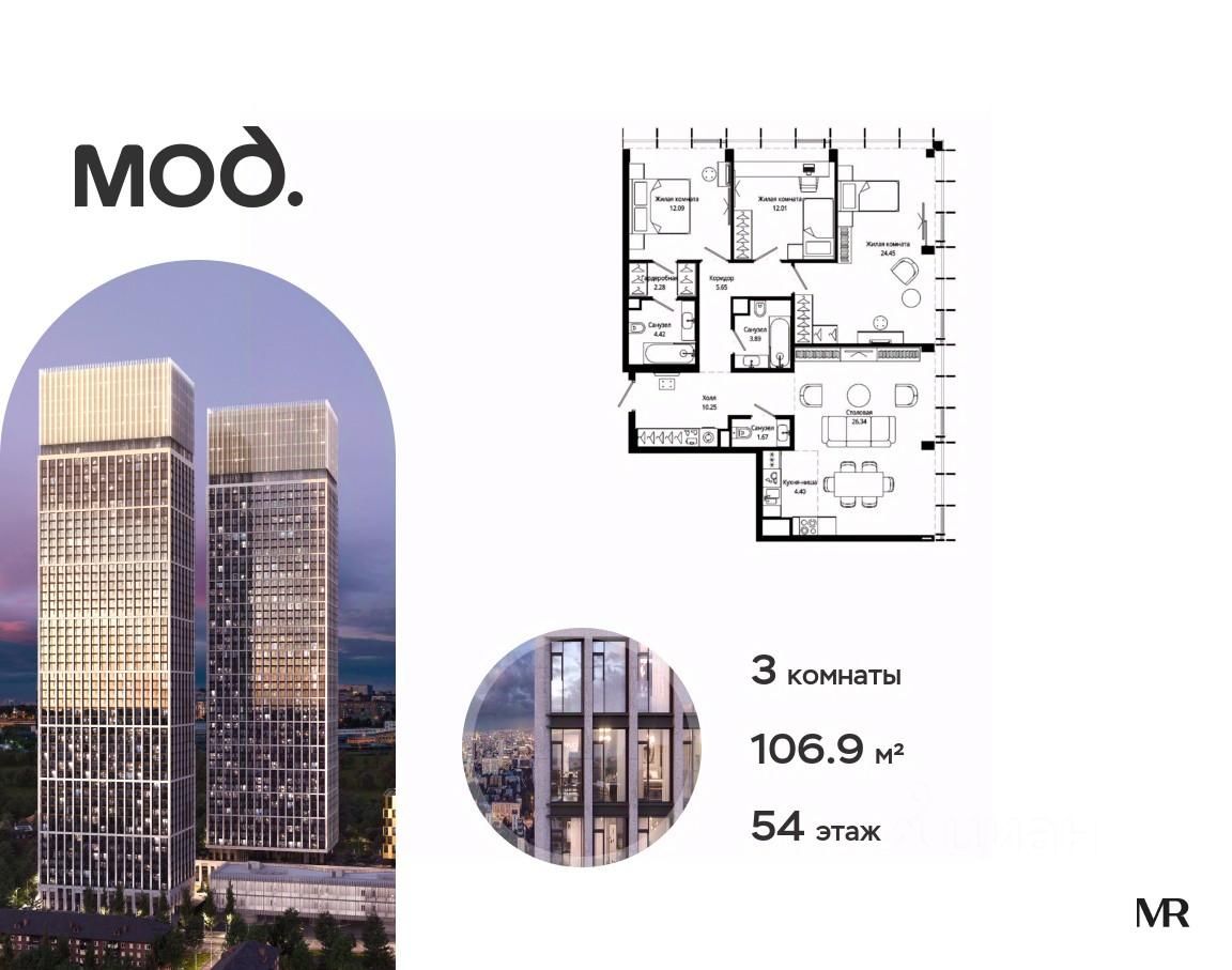 Продается 3-комнатная квартира общей площадью 106.90 м² без отделки в ЖК премиум-класса Мод на 54-м этаже 55 этажного дома.