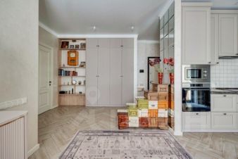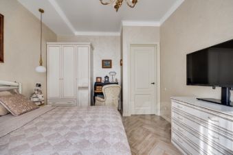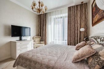 В квартире остается кухонный гарнитур с встроенной бытовой техникой, спальный гарнитур, шкафы, аксессуары, текстиль.