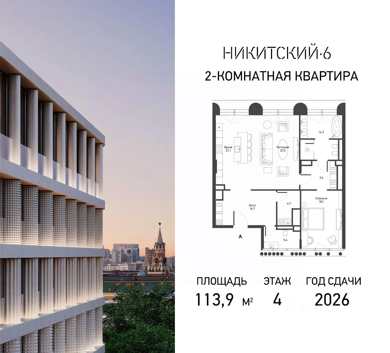 Квартира с 1 мастер-спальней общей площадью 113,9 м2 расположена на 4-м этаже жилого дома "Никитский 6". Из окон открывается панорамный вид на улицу Воздвиженку, Арбатскую площадь, Знаменку, Гоголевский бульвар. Планировочное решение включает панорамную кухню-гостиную и мастер-спальню с личной гардеробной и ванной комнатой, а также функциональные сервисные пространства.
