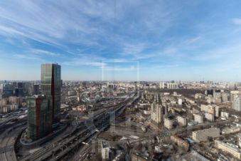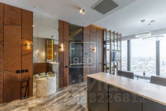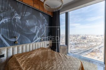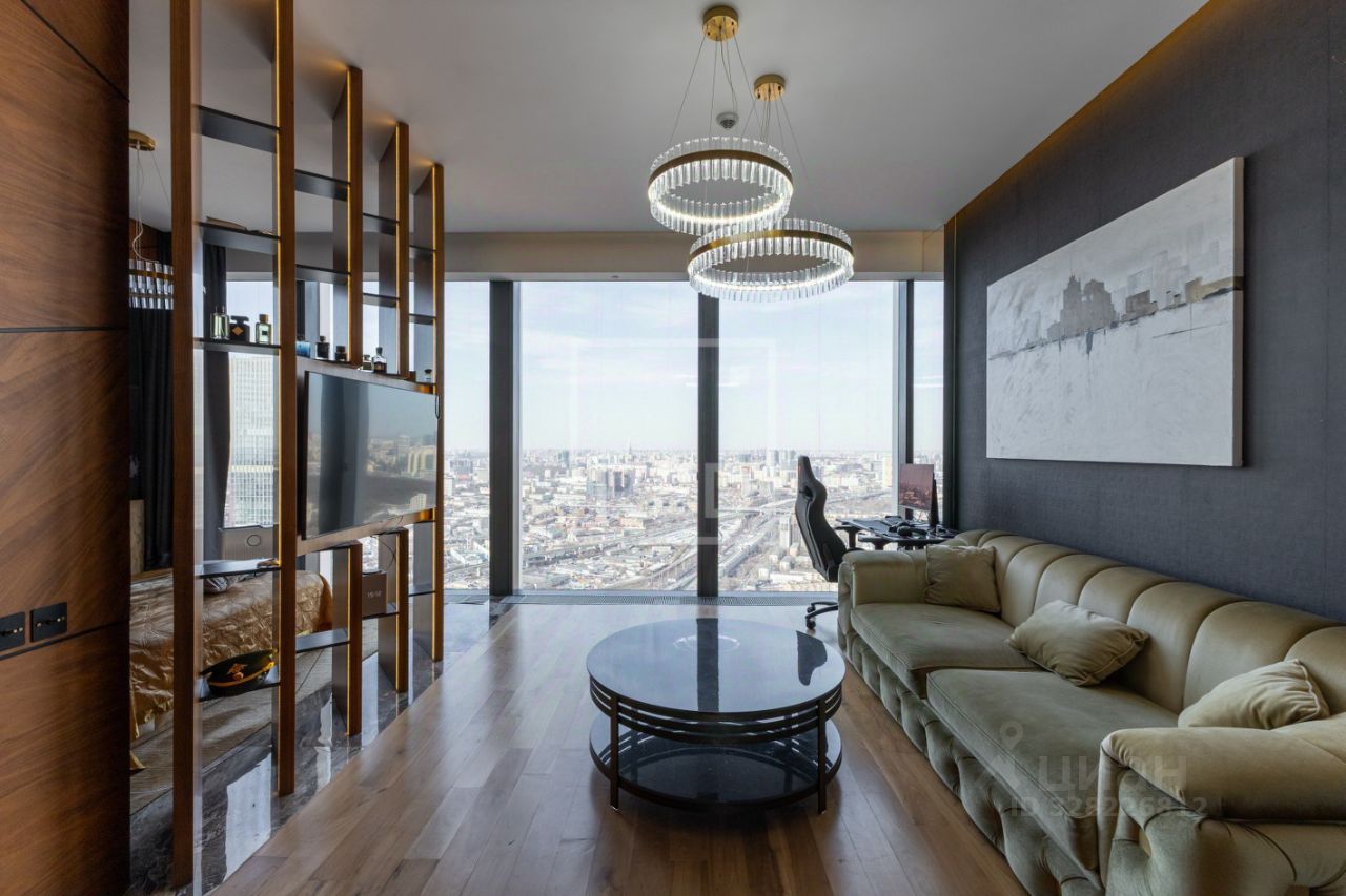 Статусная гостиная, отделанная деревянными панелями из благородного американского ореха, с панорамным видом на мегаполис. Зеркальные элементы в стеновых панелях визуально расширяют границы роскоши и комфорта.