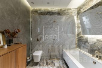 В просторном сан узле из итальянского керамогранита с европейской сантехникой разместили душевую систему и ванну.