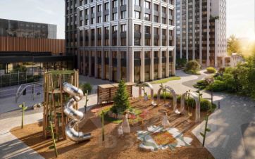Во дворе комплекса "НАЗАРЕ'" будут места как для спокойного отдыха и работы, так и для игр и спорта. Здесь организованы игровые площадки для детей всех возврастов, места для стритбола и тенниса, а также зона с природным ландшафтом и коворкинг с экологичной деревянной мебелью.