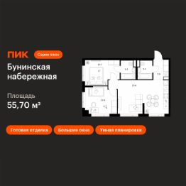 Продаётся 2-комн. квартира площадью 55,7 кв.м на 4 этаже 16 этажного дома (Корпус 2.6/1.1, Секция 1) проекта ПИК Бунинская набережная. Светлый просторный подъезд на уровне земли, функциональная планировка, большие окна, c отделкой.