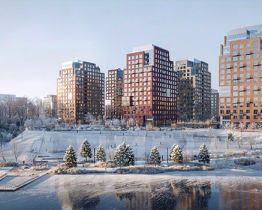 Архитекторы вдохновились локацией проекта: природные оттенки и активная пластика корпусов напоминают рельефные выступы на берегу, а окна отражают водную гладь, визуально объединяя дома с природой.