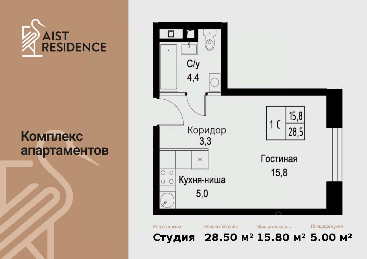 Продается студия площадью 28.50 кв.м. на 27-м этаже 30 этажного дома в "AIST RESIDENCE" от ГК МонАрх.