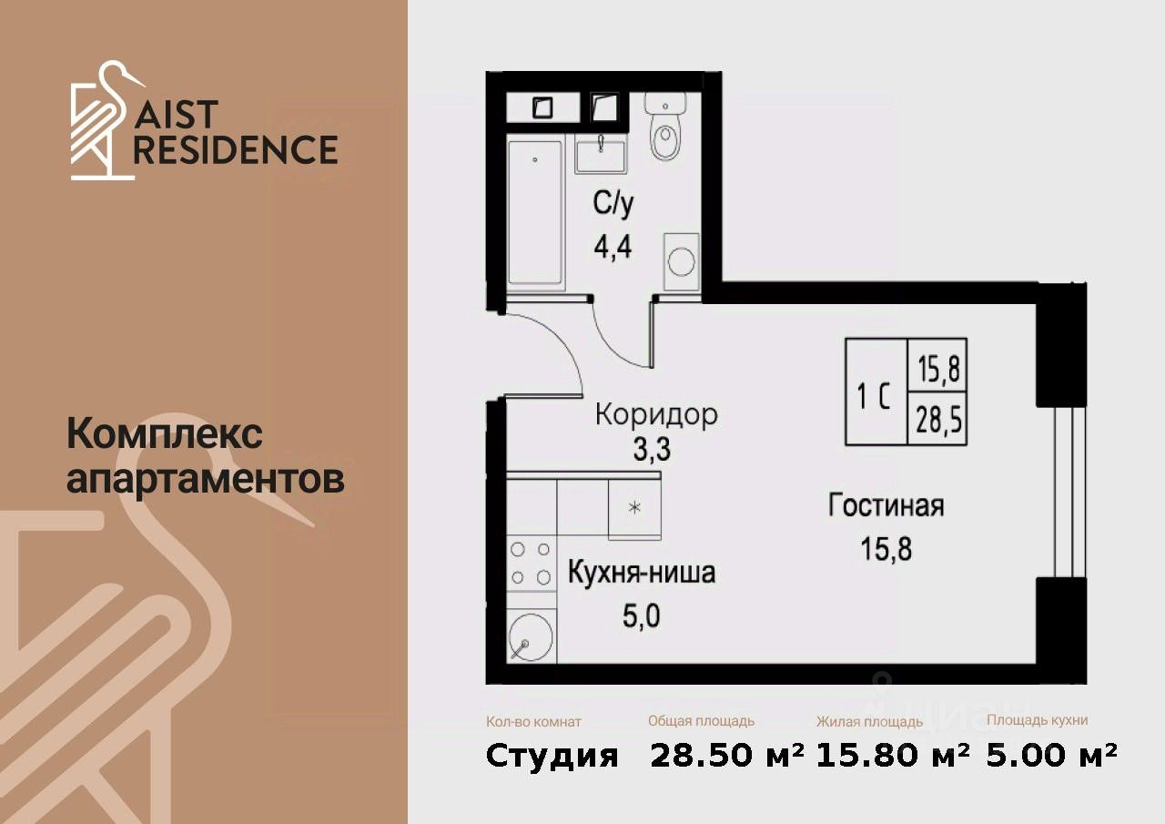 Продается студия площадью 28.50 кв.м. на 2-м этаже 30 этажного дома в "AIST RESIDENCE" от ГК МонАрх.