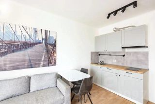В квартире сделан качественный евроремонт. Планировка студии удобная и функциональная, окна выходят во двор, поэтому в квартире тихо и спокойно. Санузел совмещенный, оформлен в современном стиле.