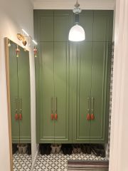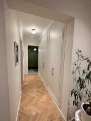 Полная замена всех коммуникаций: канализация, водопровод, отопление, электрика. Дубовый паркет, итальянский керамогранит, тёплый пол везде где плитка, двери 2,3 м, кондиционеры, шкафы на заказ — очень много мест хранения.