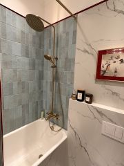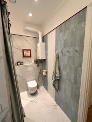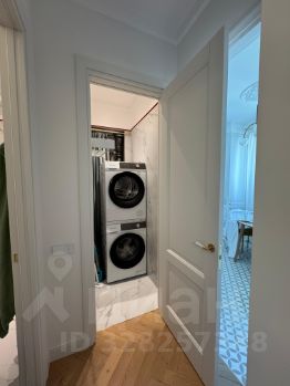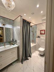 Ванная: чугунная немецкая ванна с шумоизоляцией, итальянская сантехника, подвесной унитаз, гигиенический душ, встроенный шкаф. Постирочная: стиральная машина 10,5 кг + сушка 9 кг.