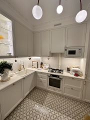 Кухня: посудомойка 60 см, электродуховка, газовая варочная панель + резервная линия 6 кВт под электро, встроенные холодильник и микроволновка, фильтр обратного осмоса, измельчитель, каменная столешница, большая керамическая раковина.