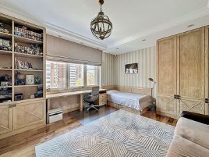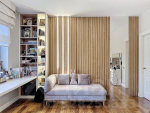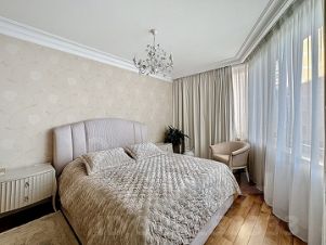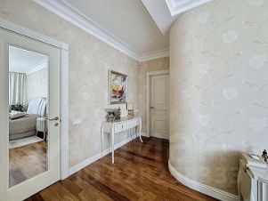 Продуманная планировка: светлая гостиная-кухня с раздвижной перегородкой, мастер-спальня с собственной ванной комнатой, изолированный блок с двумя спальнями и ванной , две гардеробные (включая постирочную), гостевой туалет и две лоджии. Панорамное остекление на три стороны, деревянные стеклопакеты, окна во двор — квартира исключительно тихая и светлая.