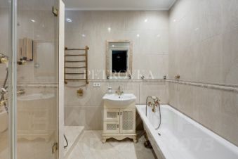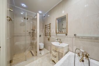 Натуральный дубовый паркет, массивные двери, изящная чугунная ванна на лапах, душевая зона.