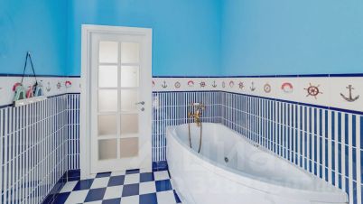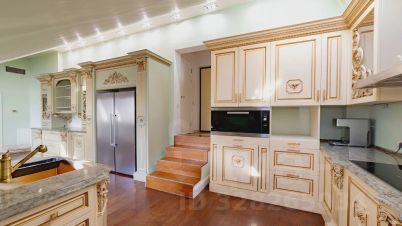 Пятикомнатная квартира площадью 345 м² расположена на шестом этаже исторического дома на Поварской улице. Пространство организовано в двух уровнях и отличается высоким потенциалом для создания индивидуального интерьера. Высота потолков — около 4 метров, что усиливает ощущение объёма и света.