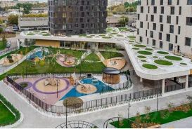 —Закрытая территория с парком-променадом. Внутренний двор полностью свободен от автомобилей. В центре архитектурного ансамбля — площадь с сухим фонтаном, кафе и ресторанами. Обустроены детские площадки с современными комплексами, баскетбольная площадка, воркаут-зона, скейт-парк, беговая дорожка.