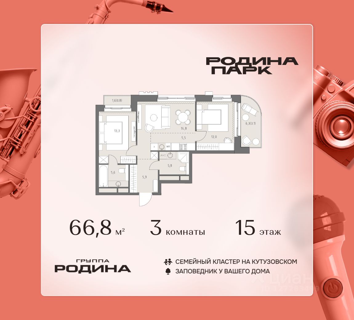 В жилом кластере Родина Парк рядом с природным заказником Долина реки Сетунь продаётся 3-комнатная квартира. Продуманная европланировка, которую легко зонировать под ваши запросы. Потолки от 3,1 м. "Родина Парк" — премиальный семейный кластер с образовательным медиакластером, строящийся на западе Москвы в окружении природного заповедника "Долина реки Сетуни". • Скидки недели на избранный пул лотов • Рассрочка 0% на выгодных условиях до 2 лет • Семейная ипотека, подбор комбо-вариантов ипотечных программ прямо в офисе продаж • Скидки 8% при 100% оплате или ипотеке. ЛОКАЦИЯ: 8 минут пешком до станции БКЛ "Давыдково". 12 минут на автомобиле до Нового Арбата. Удобные выезды на Кутузовский проспект, Аминьевское шоссе. ИНФРАСТРУКТУРА И СЕРВИСЫ ДЛЯ ЖИТЕЛЕЙ - Уникальная экосистема для развития, здоровья и творчества на территории 3,5 Га: - Первый в России образовательный медиакластер (с участием Русской медиагруппы) для творческого развития детей и взрослых с возможностью получить востребованную профессию в сфере шоу-бизнеса. - Инфраструктура и сервисы для семей с детьми на территории жилого кластера (частный детский сад, детские игровые пространства, творческие студии для занятий музыкой и танцами, безопасная и комфортная среда для детей и родителей), событийно-культурная площадка для проведения семейного досуга); - Здоровая среда (биохакинг-центр, фитнес-зал и спортивная инфраструктура во дворе, медитационные пространства, инженерные решения для освещения, свежего воздуха и очистки воды, сервисы красоты и поддержания активного долголетия); - Сервисы заботы (инфраструктура комфорта - подземный паркинг, кладовые, колясочные, консьерж- сервис, умный дом, мобильное приложение, профессиональная управляющая компания, сервисы охраны и обеспечение абсолютной безопасности) - Комьюнити резидентов (социальные пространства для дружеского и делового общения - летний атриум с уличным кинотеатром, зоны отдыха, кафе и рестораны, комьюнити-сервис с культурно- событийной программой в медиакластере); - Модуль благосостояния (комфортные пространства для работы и саморазвития - коворкинги и переговорные). ИНФРАСТРУКТУРА РАЙОНА: Насыщенная образовательная среда: филиалы МГИМО, МГУ, МГТУ, Сколково. Топовые школы: 6 лучших частных школ Москвы и области (Forbes) в 10 минутах езды. Природное окружение для пеших прогулок, спорта и отдыха. "Родина Парк" — это место, где растут и дети, и ваши возможности. Экосистема, где всё подчинено развитию — физически, профессионально, творчески.