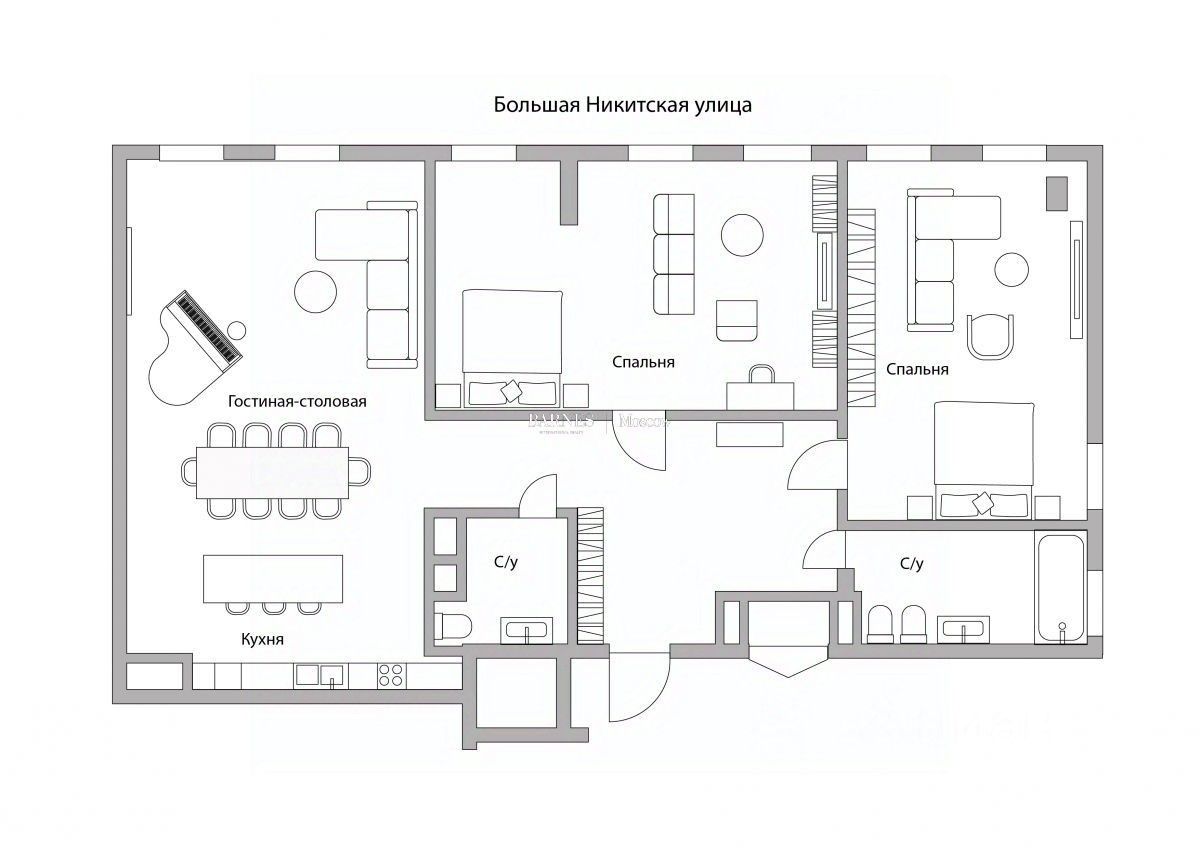Просторная 3-комнатная квартира площадью 123.1 кв.м. в клубном доме на Б. Никитской улице - историческом особняке купца Булошникова после реновации.