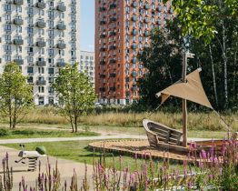Все корпуса в квартале гармонично сочетаются, образуя единую городскую среду. Между собой их объединяет невысокая этажность и натуральная цветовая гамма. Здесь приятно гулять и проводить время на улице всей семьёй.