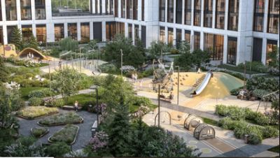 Для прогулок предусмотрен открытый просторный бульвар 3500 кв.м и два внутренних камерных двора. Внутри находятся площадки для спорта, места для игр и тихие пространства для отдыха и неторопливого общения.