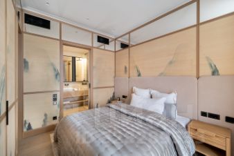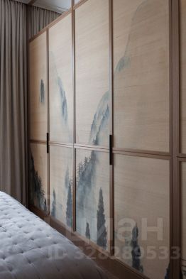 Мастер- спальня со своей ванной комнатой и душевой из натурального камня. Необычные обои по всему пространству комнаты, встроенные шкафы. Вся мебель изготовлена под заказ. Темные портьеры открываются и закрываются с пульта.