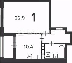 Общая площадь — 42,9 кв. м, жилая — 22,9 кв. м, площадь кухни — 10,4 кв. м. Просторная однокомнатная квартира на 15 этаже с изолированными комнатами и отличным видом на двор. Высота потолков 2,7 м создаёт ощущение простора.