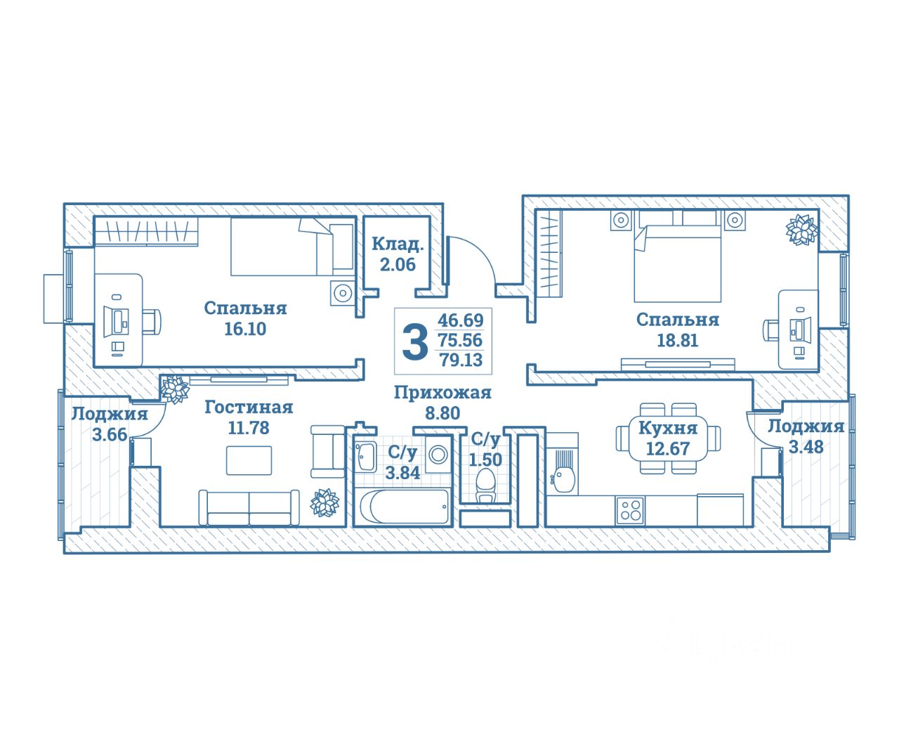 Общая площадь79,13 м²