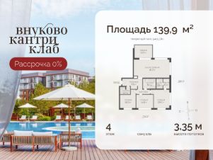 Продается видовая квартира (площадь - 139.90 кв. м., комнат - 4, этаж 4) в клубном поселке премиум-класса Vnukovo Country Club. Комплекс расположен на Западе Москвы в экологически-чистом районе в окружении Ульяновского и Валуевского лесопарков.