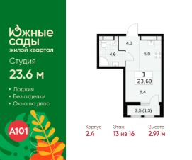 Продается студия 1006 в новостройке ЖК "Южные Сады" по адресу Москва, ЮЗАО, Южное Бутово, Жилой комплекс "Южные Сады", корп.2.4. Общая площадь квартиры - 23.60 кв. м., этаж 13 из 16, секция 8. Тип проекта, по которому построен дом - монолит, компания-застройщик - ООО "А101". Стоимость квартиры - 13118296 Р.