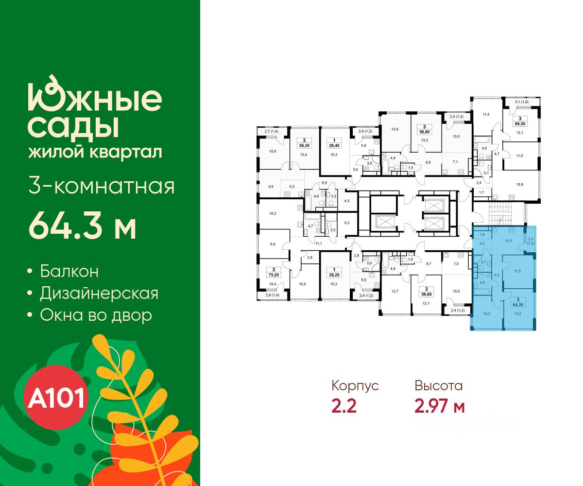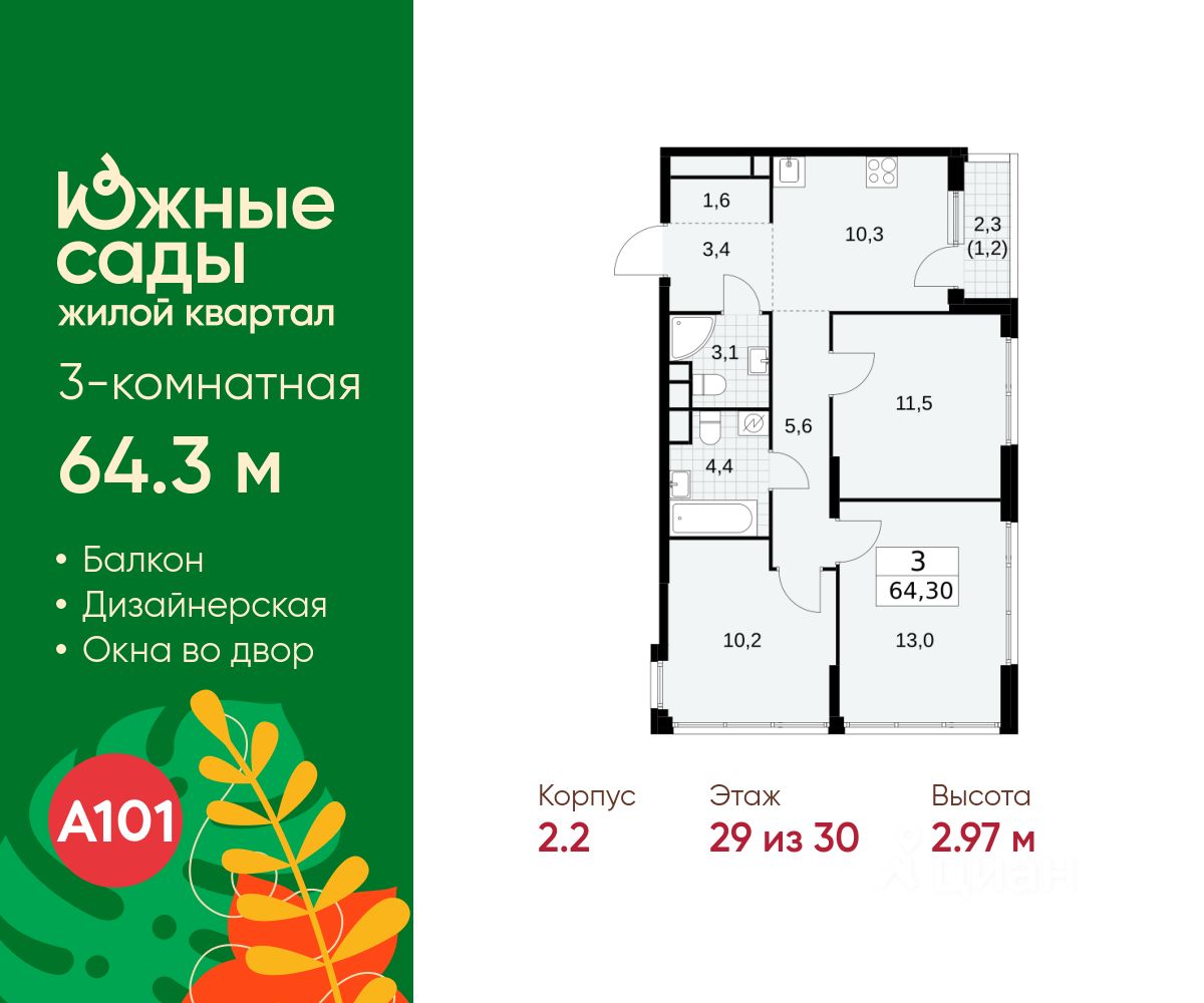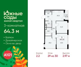Продается трехкомнатная квартира 527 в новостройке ЖК "Южные Сады" по адресу Москва, ЮЗАО, Южное Бутово, Жилой комплекс "Южные Сады", корп.2.2. Общая площадь квартиры - 64.30 кв. м., этаж 29 из 30, секция 4. Тип проекта, по которому построен дом - монолит, компания-застройщик - ООО "А101". Стоимость квартиры - 29059099 Р.