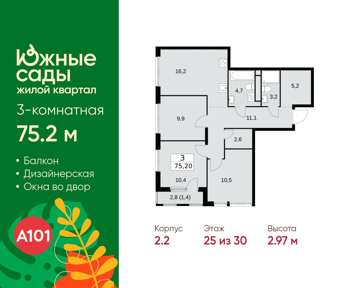 Продается трехкомнатная квартира 498 в новостройке ЖК "Южные Сады" по адресу Москва, ЮЗАО, Южное Бутово, Жилой комплекс "Южные Сады", корп.2.2. Общая площадь квартиры - 75.20 кв. м., этаж 25 из 30, секция 4. Тип проекта, по которому построен дом - монолит, компания-застройщик - ООО "А101". Стоимость квартиры - 33882112 Р.