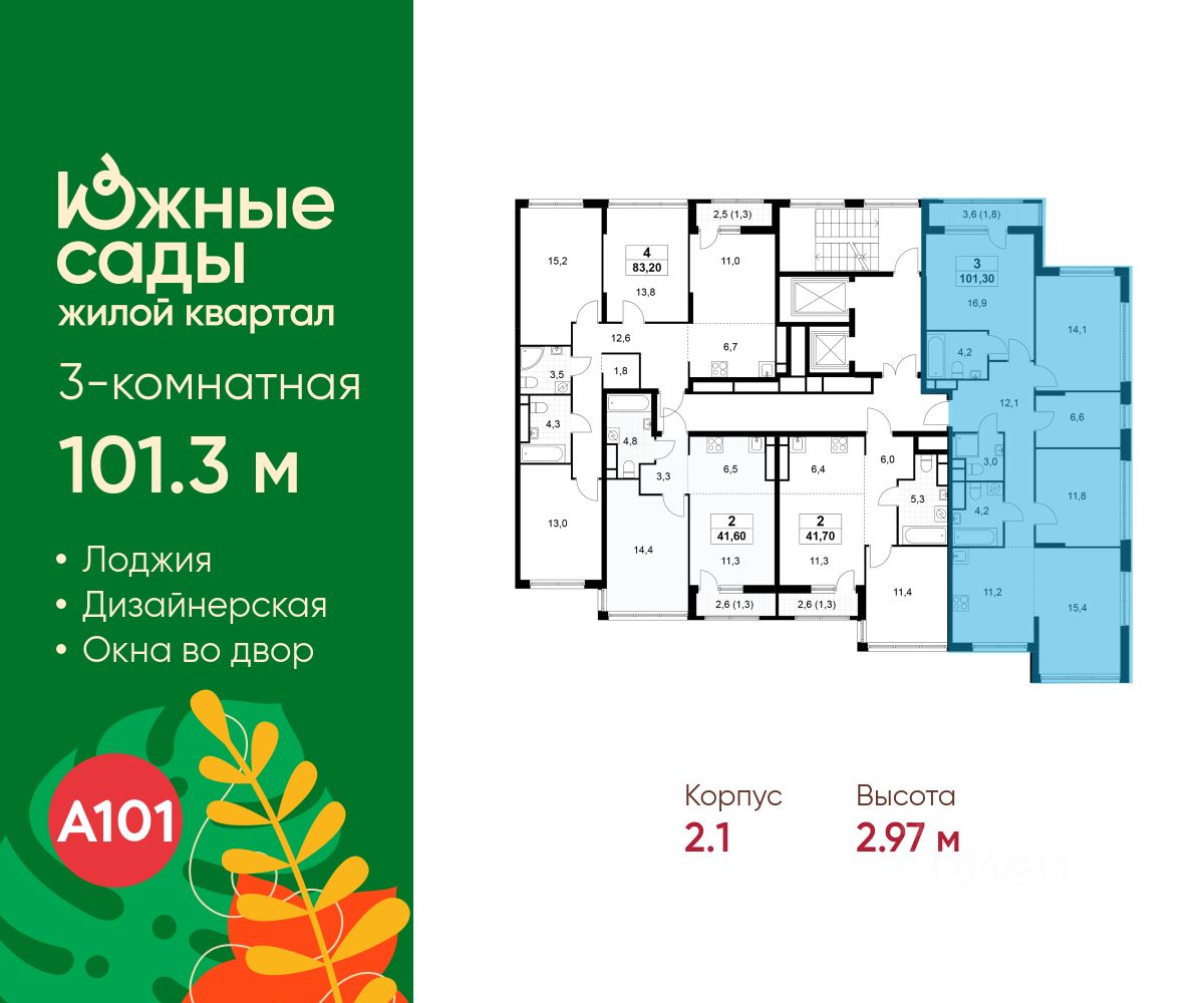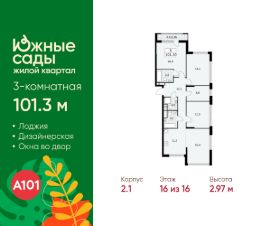 Продается трехкомнатная квартира 57 в новостройке ЖК "Южные Сады" по адресу Москва, ЮЗАО, Южное Бутово, Жилой комплекс "Южные Сады", корп. 2.1. Общая площадь квартиры - 101.30 кв. м., этаж 16 из 16, секция 1. Тип проекта, по которому построен дом - монолит, компания-застройщик - ООО "А101". Стоимость квартиры - 41314192 Р.