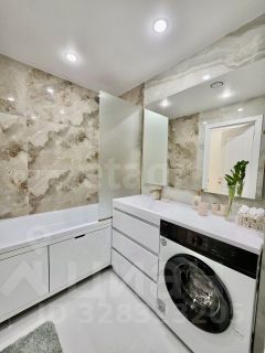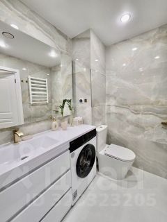 Современный санузел с ванной, стиральной машиной. Установлены счетчики. Все остается новому собственнику.