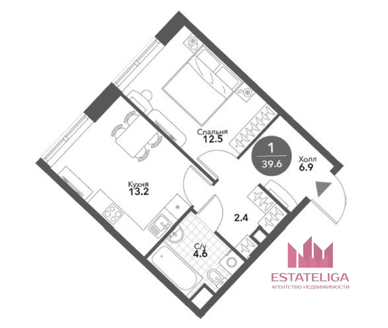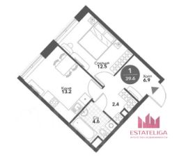 Квартира расположены на 7 этаже 20-этажного монолитного дома. Общая площадь 39,6 м², жилая зона 12,5 м², кухня 13,2 м². Высокие потолки 3,3 метра визуально увеличивают пространство. Окна выходят во двор, благодаря чему здесь тихо и уютно.