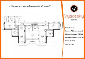 Продается просторная пятикомнатная квартира на девятом этаже 24-этажного дома, построенного в 1996 году. Общая площадь квартиры составляет 176 кв. м, жилая площадь — 110 кв. м, а кухня — 10 кв. м. Высота потолков — 2,7 метра. Окна выходят как на улицу, так и во двор, что обеспечивает хорошую освещенность и уют.