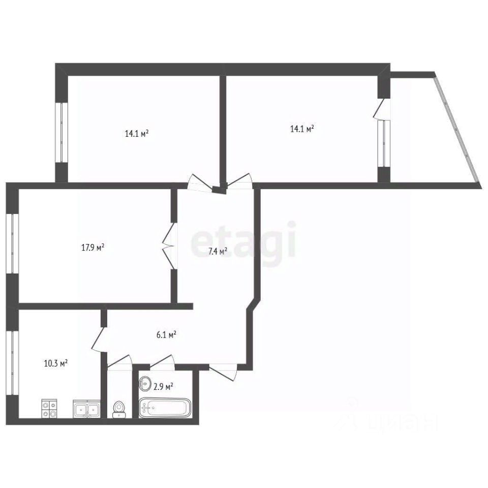 Планировка типа "распашонка" с окнами на две стороны обеспечивает хорошую инсоляцию и панорамные виды с высокого этажа. Общая жилая площадь 46,1 кв.м дополняется просторной кухней в 10,3 кв.м, что создает основу для комфортного проживания семьи.