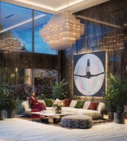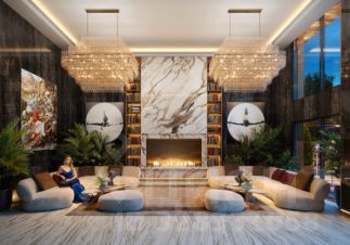Просторное гранд-лобби с высотой потолка 7м. Дизайн Гранд Лобби выполнен в стиле классических люксовых отелей с использованием премиальных материалов.