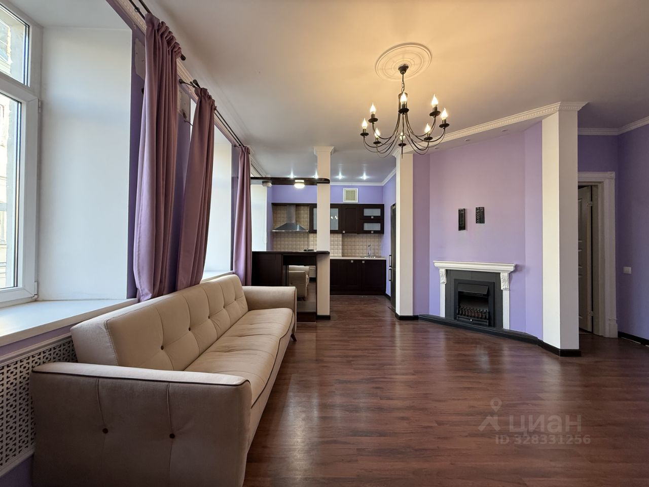 Высокие потолки, камин.