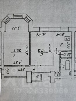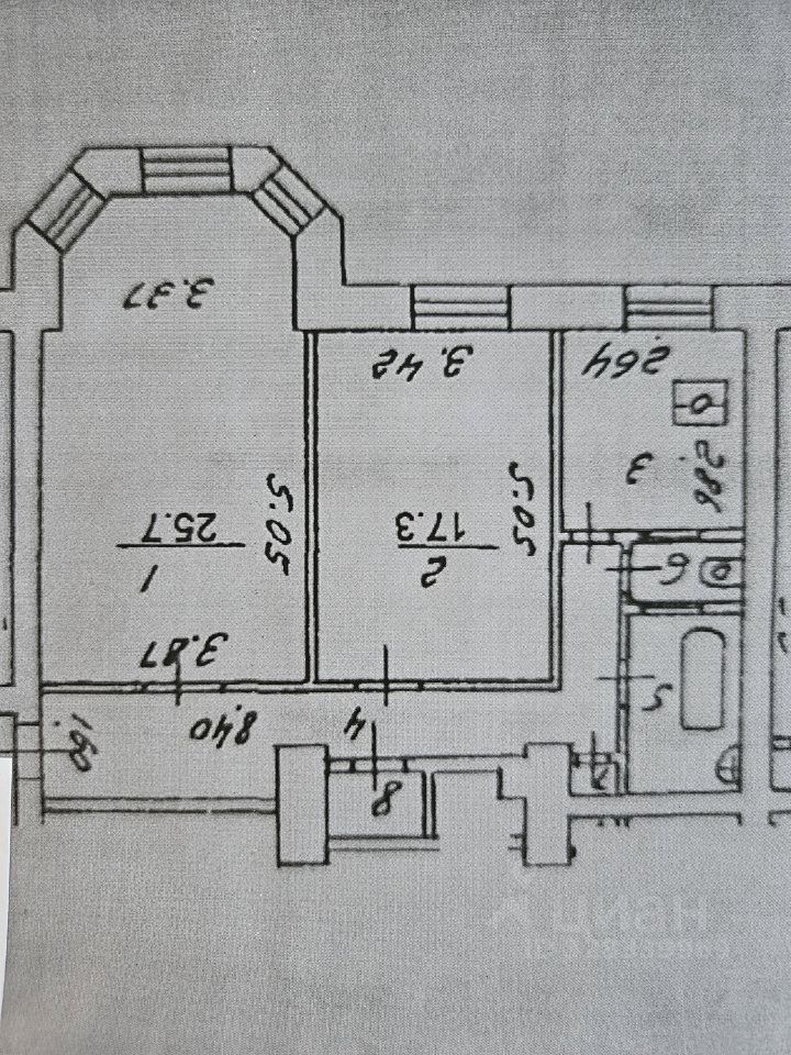 Две большие изолированные комнаты 25,7 кв.м и 17,3 кв.м. В большой комнате эркерное окно. В квартире есть темная комната и встроенный шкаф, балкона нет. Раздельный санузел с большой ванной 4,2 кв.м. Квадратная кухня 7,5 кв.м.