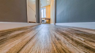 • Пол в коридоре — керамогранитная плитка Kerama Marazzi под дерево: износостойкая, не скользит, легко моется.