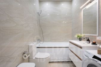 Ванная комната так же оборудована всем необходимым — стиральная машина, зона хранения.