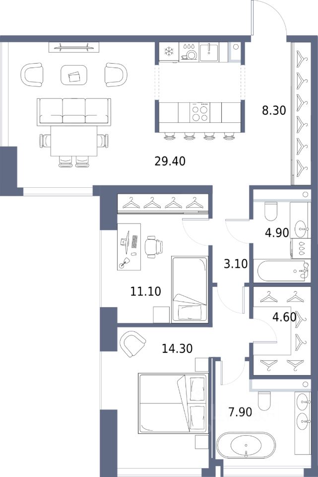 Двухкомнатная квартира с предчистовой отделкой в ЖК "Северный Порт" на 2 этаже. Общая площадь: 83.6 кв.м., жилая: 25.4 кв.м., площадь просторной кухни-столовой: 29.4 кв.м. Угловая квартира, окна oбecпeчивaют paвнoмepнoe ocвeщeниe в тeчeниe дня. В квартире два совмещенных санузла. Высота потолков 3.15 м.