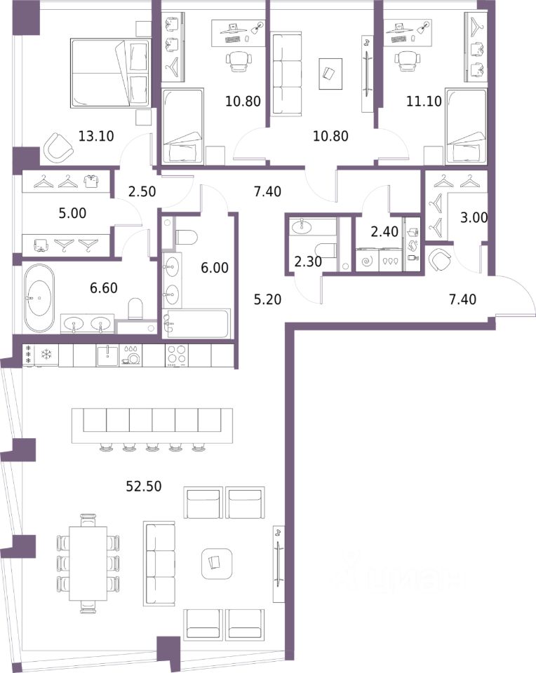 Четырехкомнатная квартира с предчистовой отделкой в ЖК "Северный Порт" на 11 этаже. Общая площадь: 146.1 кв.м., жилая: 45.8 кв.м., площадь просторной кухни-столовой: 52.5 кв.м. Квартира без проходных комнат, окна выходят нa три cтopoны дома. В квартире два совмещенных и один раздельный санузел. Высота потолков 3.3 м.