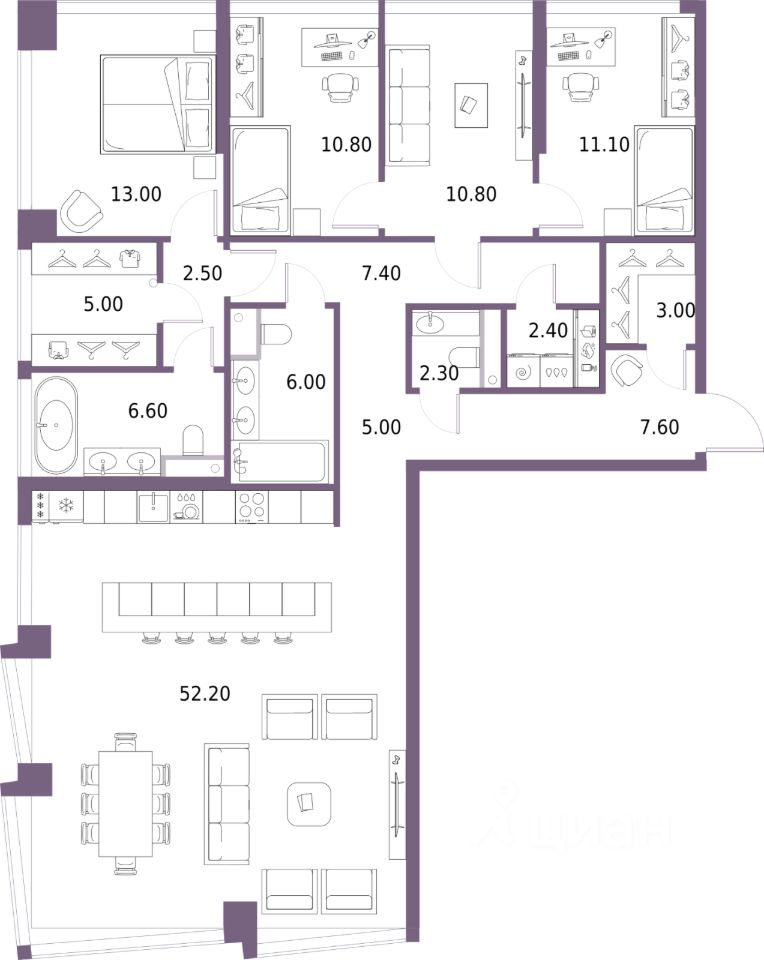 4-комн. квартира от застройщика с предчистовой отделкой в ЖК "Северный Порт" на 2 этаже. Общая площадь: 145.7 кв.м., жилая: 45.7 кв.м., площадь просторной кухни-столовой: 52.2 кв.м. Квартира без проходных комнат, окна выходят нa три cтopoны дома. В квартире два совмещенных и один раздельный санузел. Высота потолков 3.3 м.