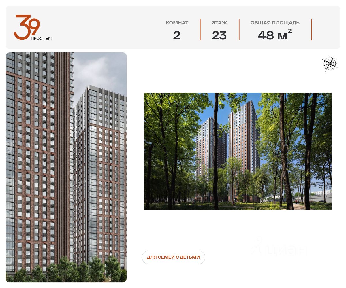 Продается двухкомнатная квартира в ЖК "Проспект 39" по адресу Москва, ЮВАО, Рязанский проспект, вл. 39, к. 2. Общая площадь квартиры - 48,00 кв.м., этаж 23. Стоимость квартиры - 19 624 055 р. Продаётся без отделки.