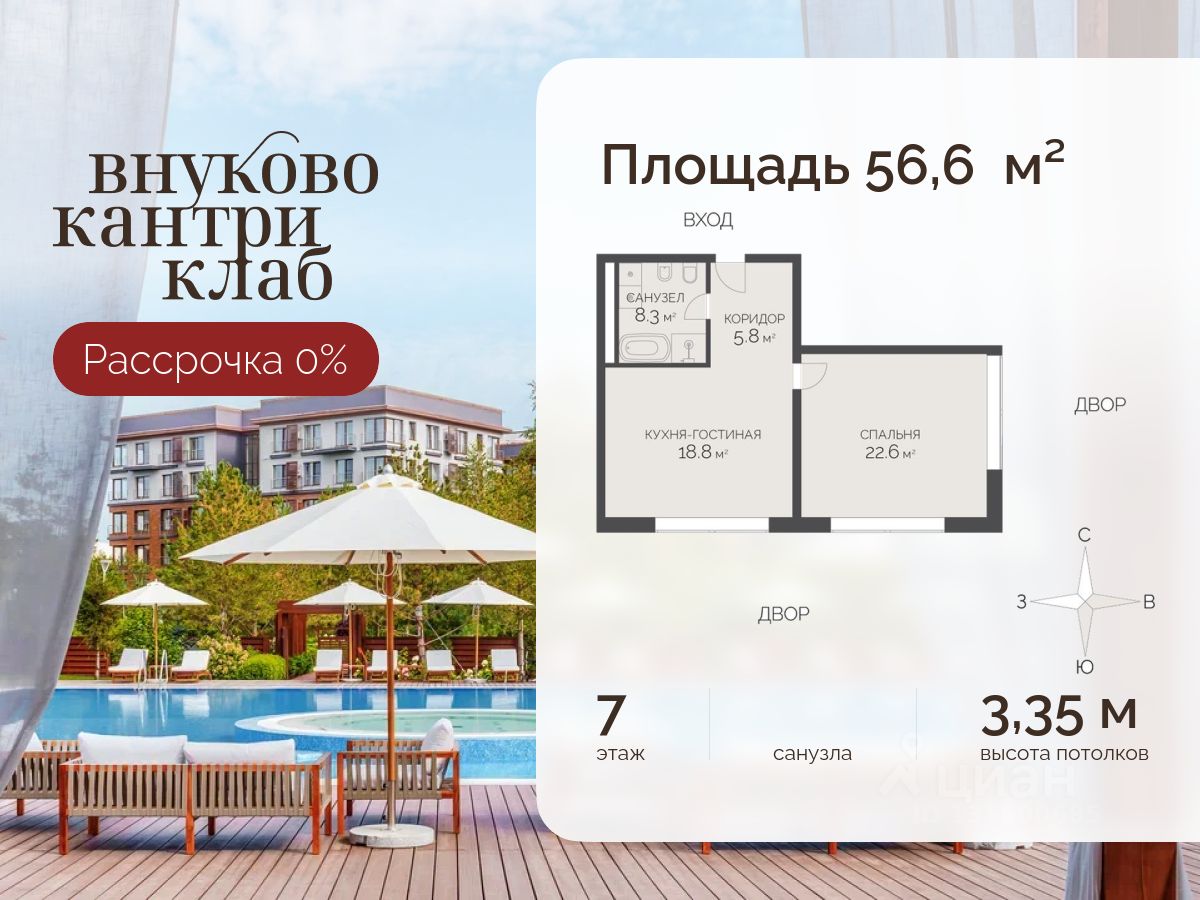 Продается видовая квартира (площадь - 56.60 кв. м., комнат - 2, этаж 7) в клубном поселке премиум-класса Vnukovo Country Club. Комплекс расположен на Западе Москвы в экологически-чистом районе в окружении Ульяновского и Валуевского лесопарков.