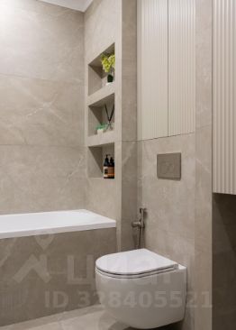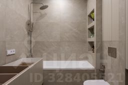 Ванная комната выполнена из качественных и современных материалов в светлых тонах.