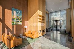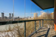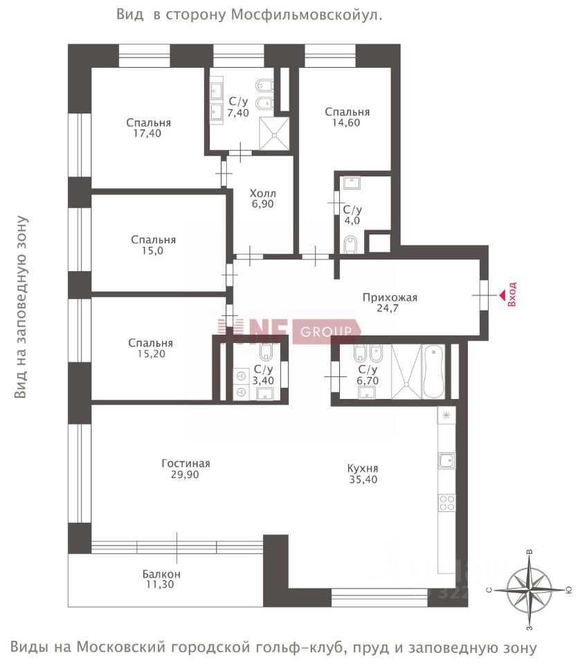Квартира предлагается без отделки, что позволяет реализовать индивидуальный дизайн-проект. Панорамные окна ориентированы на три стороны света и открывают виды на гольф-клуб, пруд и заповедную зону, создавая ощущение уединения и близости к природе.