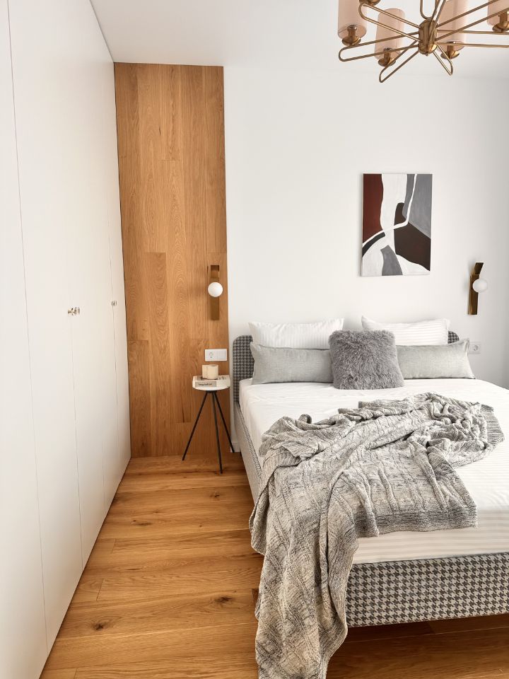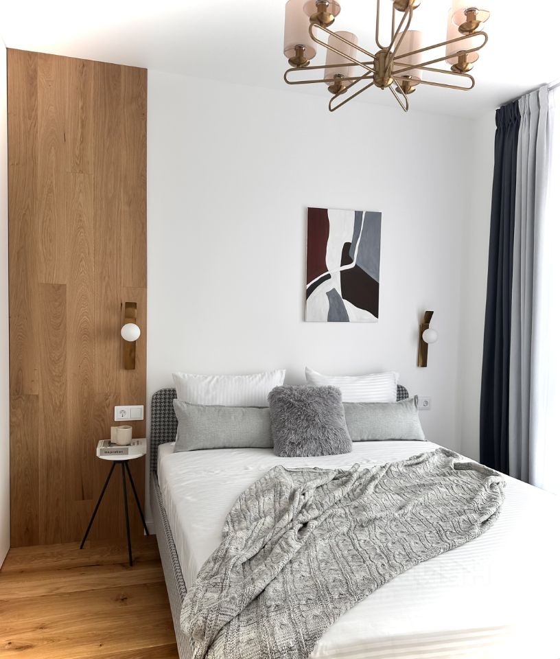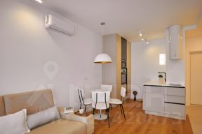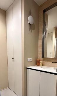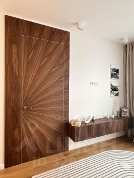 В квартире выполнен качественный дизайнерский ремонт: полы — керамогранит и инженерная доска, стены под покраску, вся мебель встроенная и заказная. Двери Union высотой 240 см по проекту, зеркало и шпон.